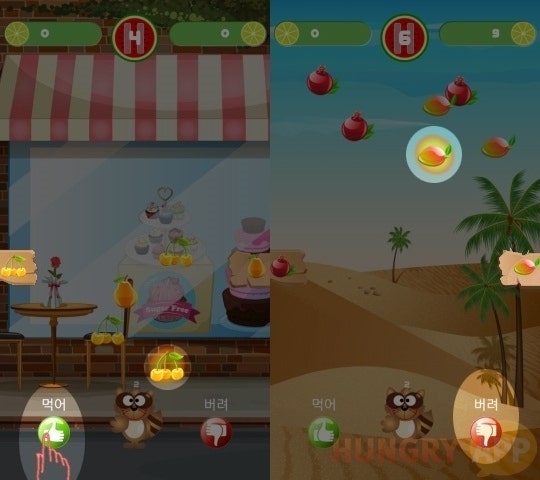 게임이 시작되면 화면에서 여러 음식이 내려온다. 화면 양 끝에는 내려오는 음식이 고정되어 제시되는 데 왼쪽은 먹어야 할 음식, 오른쪽은 버려야 할 음식이다. 반짝이는 음식 순으로 알맞게 먹거나 버리면 된다. 중간의 동물 캐릭터는 터치하면 음식 2개를 제거해주는 기능으로 위급상황에서 사용한다.