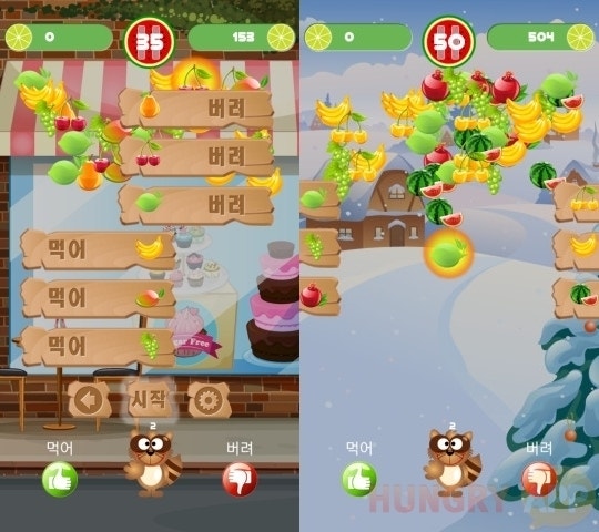 난이도는 초급, 중급, 고급의 3단계로 구성된다. 각 단계가 증가할 때마다 선택할 음식리스트가 2종류씩 늘어난다. 고급 단계에선 총 6가지의 음식리스트가 등장하며 5개 이상의 과일을 맞출 때마다 양쪽에 제시된 먹거나 버릴 음식들이 랜덤으로 하나씩 뒤바뀐다. 초급이 쉽다면 시작부터 고급으로 진행할 수 있다.