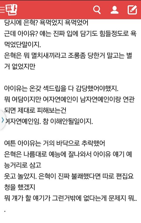 예전에도 아이유가 영악하다느니 여우같다느니 하는 얘기는 늘 하는 애들있었고뭐 한우사건? 뭐 이딴 말같지도 않고 다 해명하고 끝난 사실을 들고와서계속 욕하려고 하는 애들이 있긴있었어