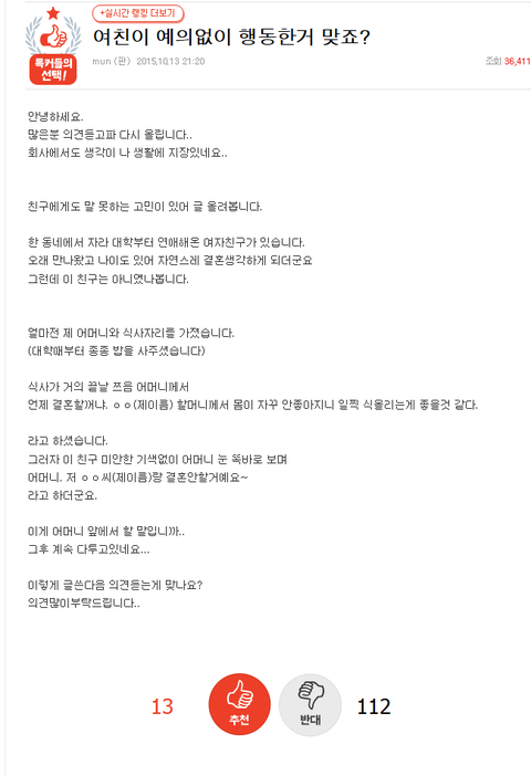 그런데 대부분 남자가 잘못했고, 남자 어머니가 예의가없다는 소리만 있고... 여자가 잘못했다는 덧글을 적은데요.