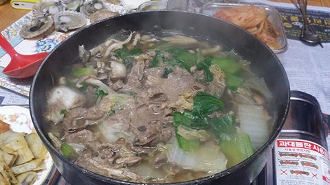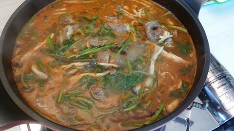 멸치&다시다 육수 우려내고 고추장과 고추가루를 이용한 양념장을 넣고 미나리와 버섯, 쇠고기로