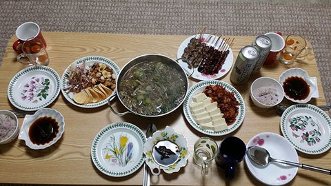 주변 사람들이 샤브샤브를 좋아해서 메인으로 하고 닭염통꼬지, 두부김치, 오징어와 땅콩 등