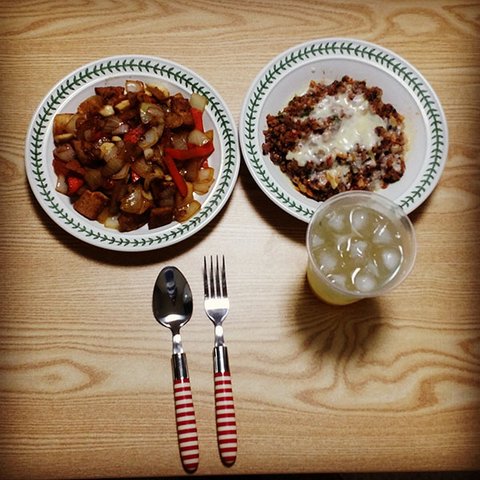 야채들을 간장과 굴소스를 이용해 볶은 참스테이크와 간단히 볶은 밥 위에 치즈를 올려 먹었어요!