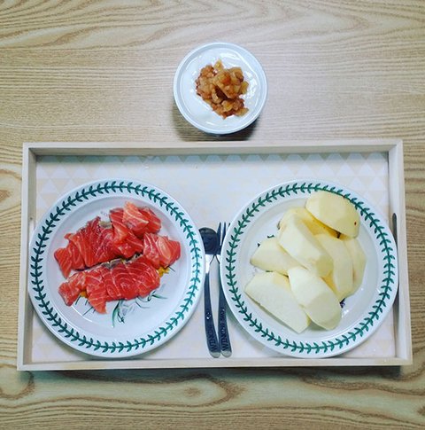싸게 구매해서 이렇게 사과와 함께 자주 먹곤 합니다. 연어 너무 좋아요~ 진짜진짜!