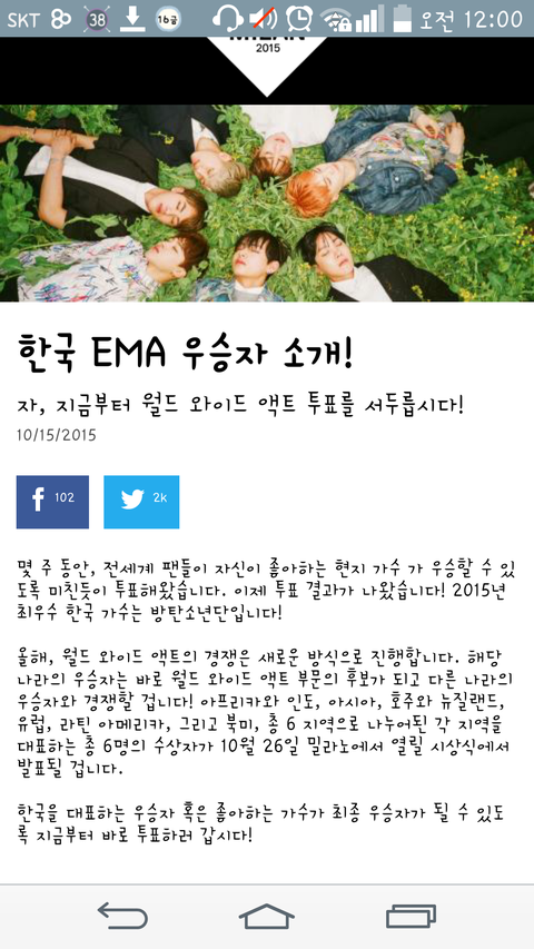 아미들 대단하다진짜! 방탄 밀라노에서 상받을수있게 투표ㄱㄱ!!