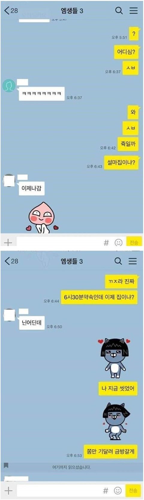 진지 빨아서 미안한데 개인적으로 약속 안 지키는 새끼들 조카싫다. 저기 나온 애들은 뭐 서로 약속 안 지키니까 끼리끼리 만나서 트러블 없겠지만, 난 약속 중시해서 시간 늦는새끼들 진짜 극혐이다