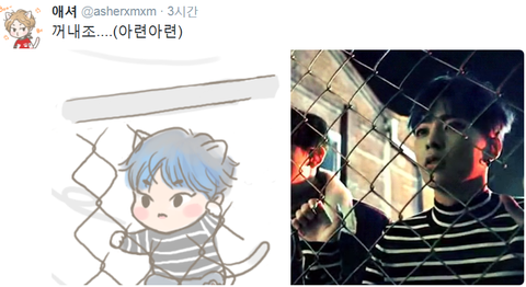 트윗에 새로뜬 애셔님 팬아트 ㅋ 철조망 안 슈냥이의 저 간절한 눈빛 좀 봐 슈냥아 니가 너무 섹시큐티해서 못 내보낸닷 ㅋㅋㅋ