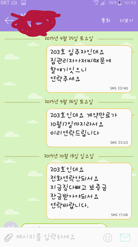 1년을 채우고 이사를 가는데 집주인은 전화도 받지않고 그래서 문자를 저렇게