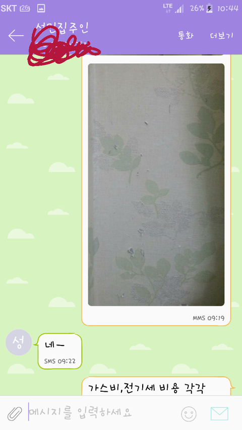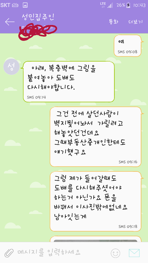 너무화가나고 술먹은사람과 무슨대화를 하겠냐는 생각에 아까 처음 보냇던 캡쳐와같이 집주인에게 문자를 했지요.