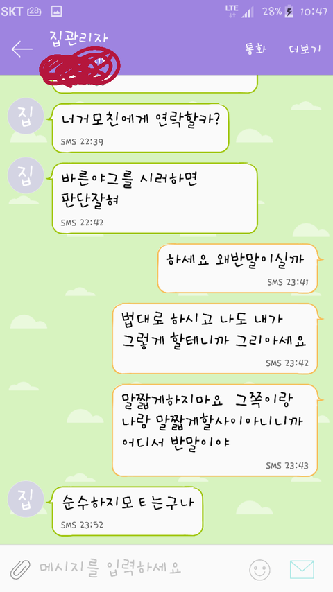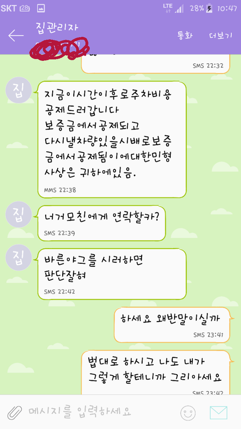 그리고 집주인분과 경찰분들덕분에 통화가 처음으로 되서 관리자아저씨의 만행을 간략하게 말했더니 자기가 얘길하겠다고 하시더라구요. 그래서 그것도 그렇지만 그분께 저희에게 전화로 무례하게 하신것에 대해 직접 사과듣고싶다.그분이 직접 사과전화해달라고 말씀드렸더니 아랏다고 하시고는 전화를 끊으시더니