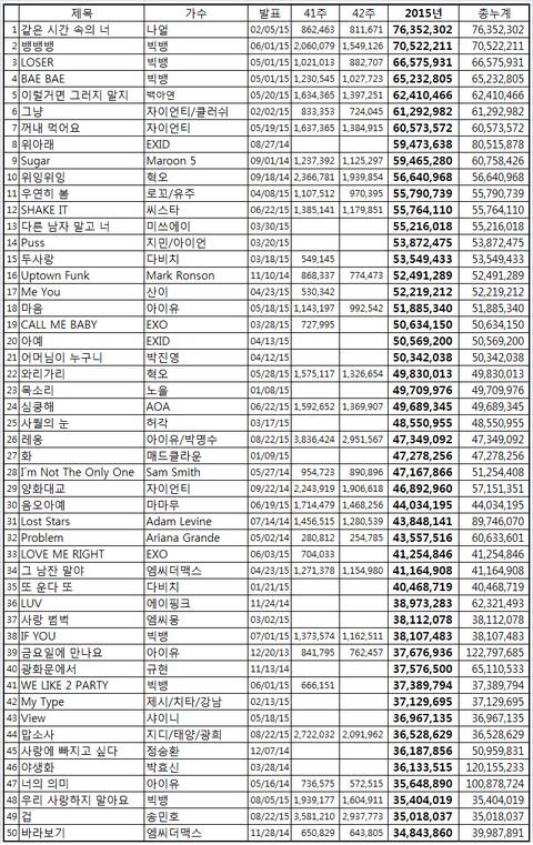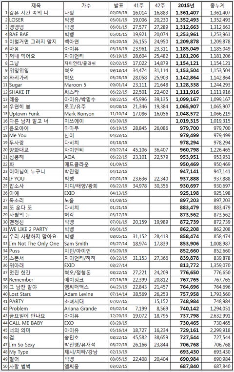 2015년 현재 음원 다운로드 스트리밍 순위