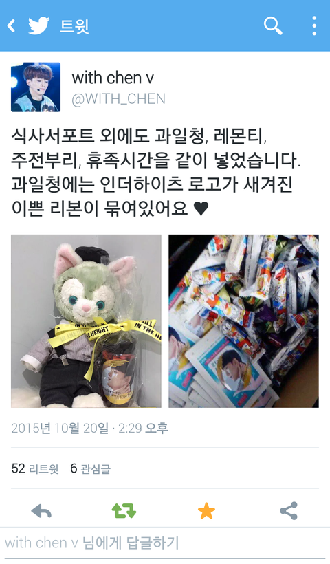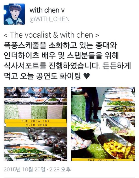 저번 첸더하이츠 조공도 쩔더만 여기도 ㅎㄷㄷ 또 배우분들 인증샷 올려주시겠다 ㅎㅎ종대 맛난거 많~이 먹고 빡빡한 스케쥴 힘내고 열심히 하길 첸베니 최고