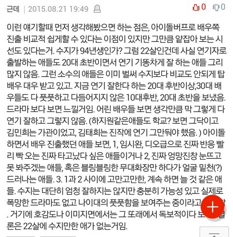 요즘 니들이 연기잘한다고 칭찬하는 배우들 거의 다 초반에 연기못한다고 욕먹었었어 난 아직 예고편??안봐서 모르지만 수지가 배우로 갈꺼면 딱히 지장은 없음 다른 이름있는 배우들 대부분 그랬으니까 근데 아이돌 계속할건데 연기쪽에 기웃거리는건 문제지만╋그니까 연기욕심없으면서 괜히 이쪽저쪽 찔러보는거면 문젠데 본인이 하려는 의지만 있으면 경력 쌓으면서 늘 가능성도 있다는 소리