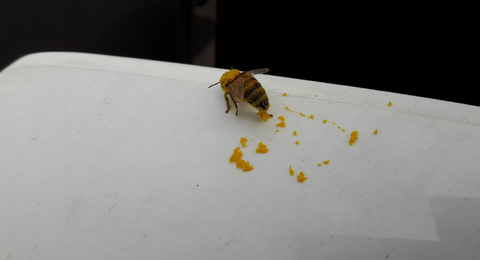 어디서 꽃가루를 머리부터 발끝까지 묻히고와서 다리를 이리저리 비비며 꽃가루를 빽미러 위에 다 털어 놓고 있어요.