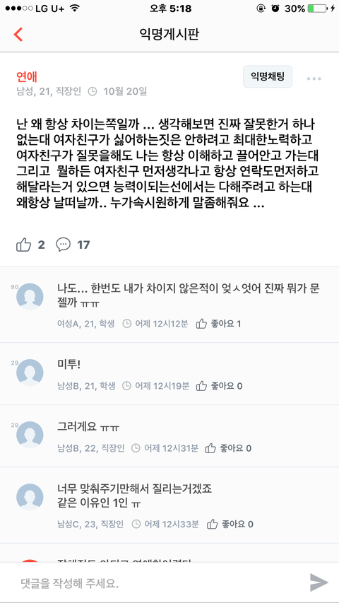 난 진짜 매번 맞춰주고 노력하는데 상대는 노력한번 안하고 이별을 택하는게..