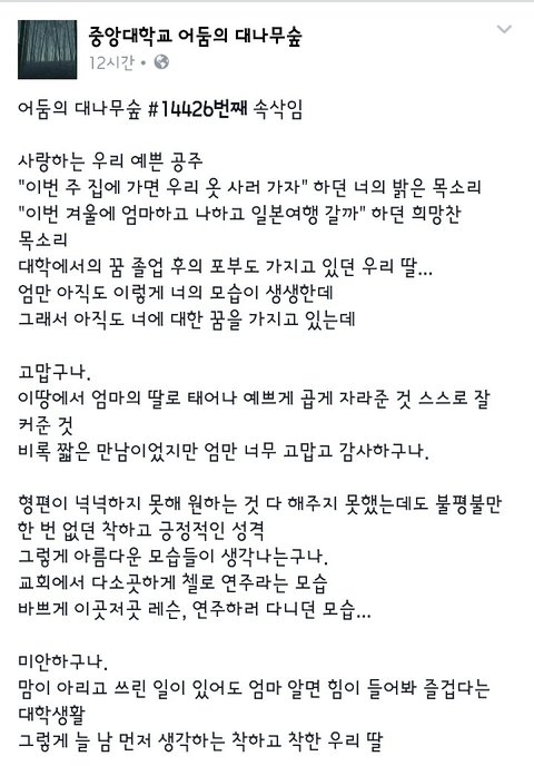 중앙대 자살하신분 어머니가 쓴 글.. 별생각없이 던진 돌맹이에 맞아 죽을수있단생각안하냐....