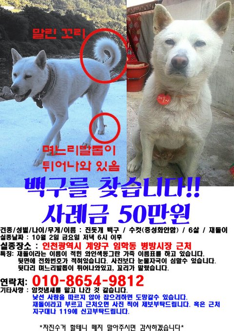 인천 계양구 백구 재돌이를 찾습니다.