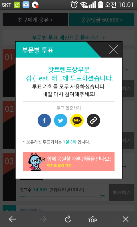 ★또한 타가수들한테도 투표하고, 캡쳐한걸 캡쳐해서 타가수의 해당앨범 리뷰판에 올려서 겁도 투표부탁드린다고 살포시 이야기하는 것도 방법이예요!