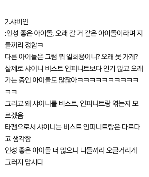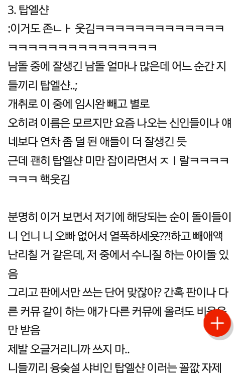 그리고 '~미만잡'이런식으로 글 올리는 얘들이 팬이라고 단정지을수 있냐ㅋㅋ 입장바꿔생각해봐라 니네는 팬닉 달고 그렇게 당당하게 망글 쌀수있는지ㅋㅋ