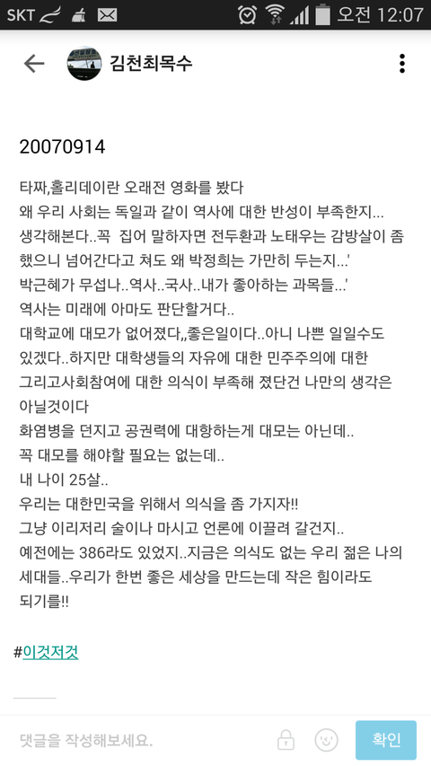 오랜만에 싸이월드 다이어리 쭉 보다가 발견했네요.저는 이명박이 대통령되는것도 반대했고 박근혜도 반대했습니다.그들이 대통령이 되었을때 우리나라에 찬란한 미래가 없을거라 확신했기 때문이고 결국 그렇게 되어가는 현실에 답답할뿐입니다.