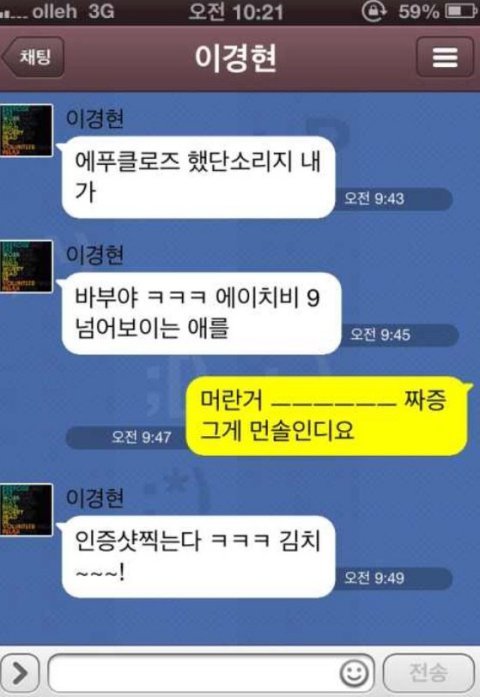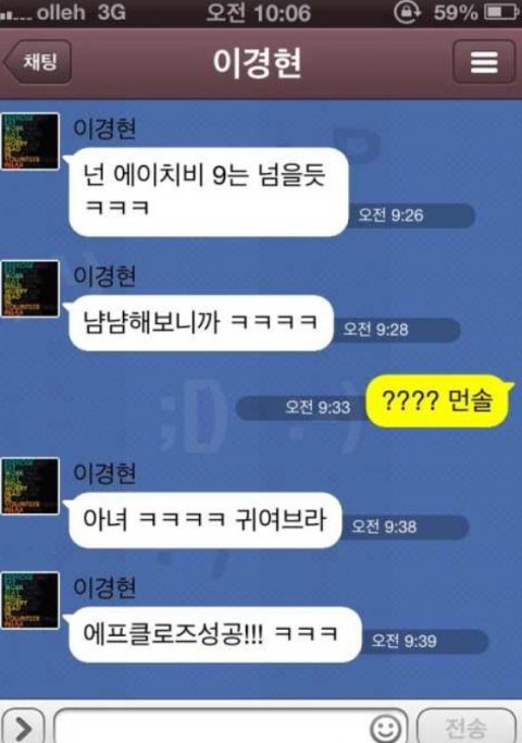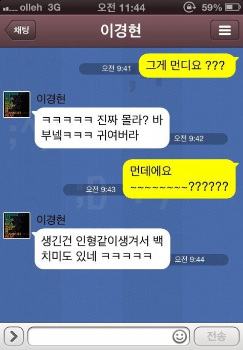 안녕 난 구오년생여자구 버스타구 친구만나러가다가 어떤사람이 친구로라도 진해고싶다해서 번호준 사람이 있어 지금은 쫌 친해졌는데 몇번 만났어 근데 카톡에서 무슨 소릴 하는지 모르게써 ㅠㅠ 남자들이 쓰는 은어가튼건가?? 이게 무신 뜻이야??