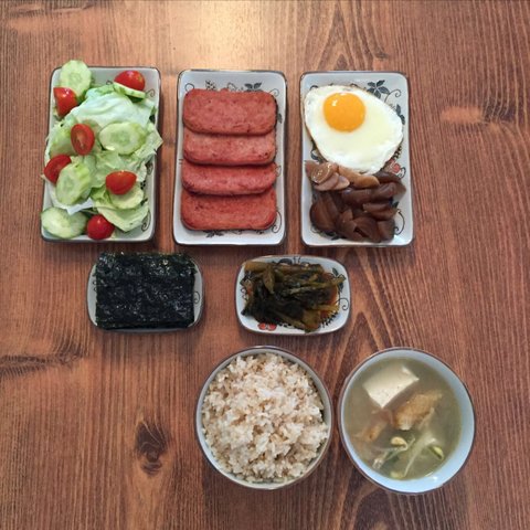 그냥 밥에 스팸 구워 특별한 반찬 따로 차리지않고 계란후라이에 마늘,양파 장아찌 이렇게 한상