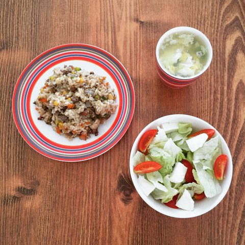 소고기 야채 볶음밥에 멸치육수에 계란 휘휘 풀어넣어 달걀국, 카프레제 샐러드까지 곁들였습니다