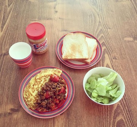 치즈 듬뿍 넣은 오믈렛과 시판 토마토소스에 갈은 소고기,방울토마토만 더 넣어서 곁들였습니다