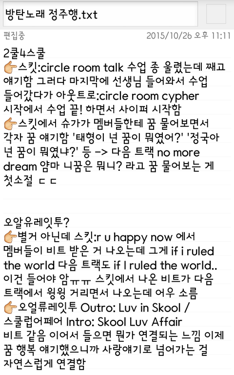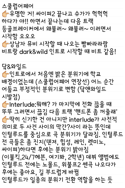 방탄 앨범에는 뭔가 이렇게 연결되는 것들이 많아서 듣는 재미가 있음 밤에 방탄 전곡 재생해봐바 트랙 순서대로 ㅋㅋ