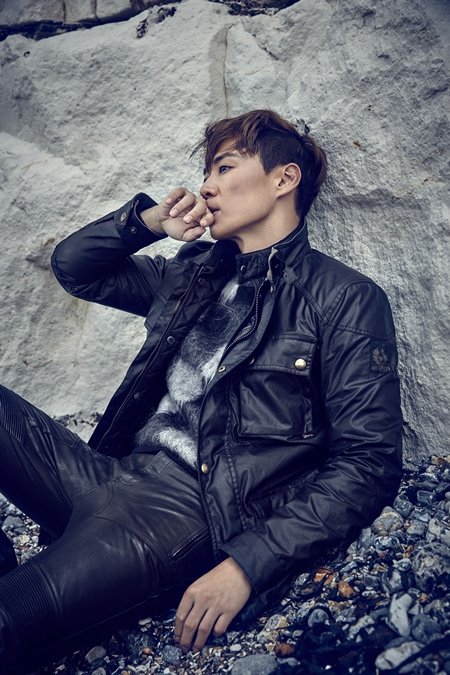 푸른 초원에 벨스타프 옷 입고 서있는데