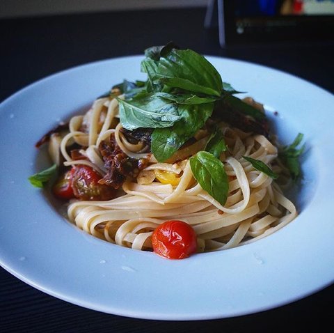 토마토와 바질을 곁들인 알리오 올리오 파스타