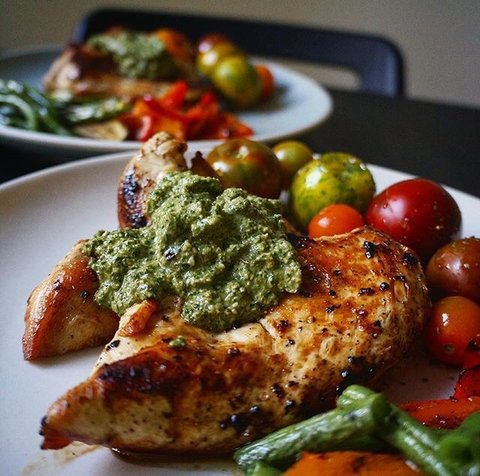 마지막으로 바질 페스토를 곁들인 닭가슴살 구이입니다.