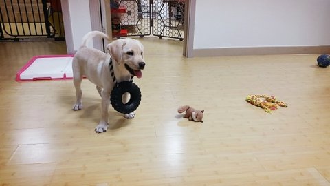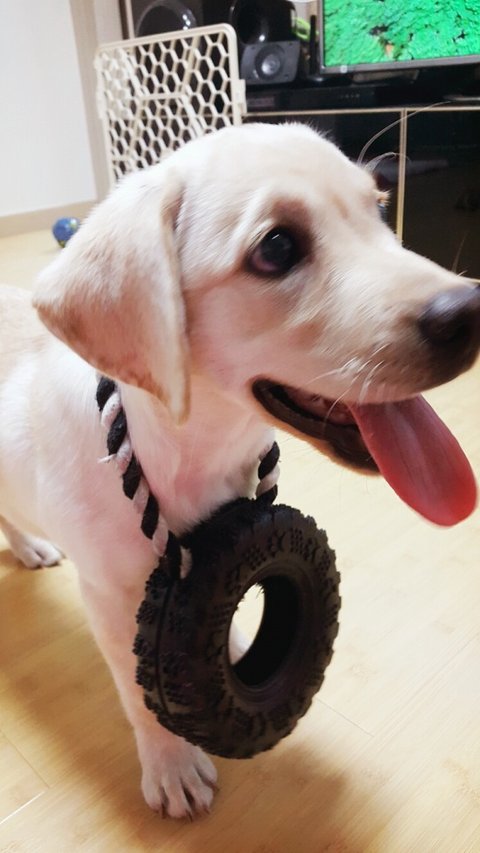 건강이가 타이어장난감을 너무 좋아해요~ 가지고놀다가 머리가 들어갔는데