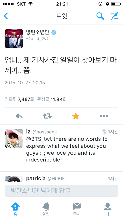 잘 지내는거같아 부럽기도 하고 어무니 너무 귀여우심ㅠㅠㅠ일일히 다 챙겨보시는것도 그렇고 팬들 반응 확인하시는것도 그렇고❤️