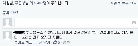 난 밥버거 프랜차이즈 기획팀에서 일한지 10개월된 사초생인데 우리 대표가 작사를 하고 가수들 써서 음원을 냈거든? 그 음원 티저를 페이스북에 올렸는데 댓글도 많이 달리고 좋아요도 많이 눌렀길래 내 댓글은 아무도 안보겠지 라는 생각에 장난으로 댓글을 남겼어