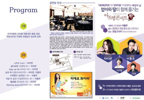 이번에 11월 8일 호텔 프리마 그랜드 볼룸에서 개최되는 ‘페경의 날’ 기념 콘서트는 엄마와 딸이 함께 즐기는 콘서트라 의미가 클 것 같네요^^ 1부에 푸른 아우성의 구성애 대표와 건국대학교병원 이지영 산부인과 전문의의 폐경 강좌와 성교육 강좌가 준비되어있고 2부에는 뮤지컬배우 차지연과 이충주의 미니 콘서트(지금 이 순간, 황금별 등등) 를 통해 토크와 강연, 음악이 어우러진 신개념 콘서트 방식으로 진행될 예정이라고 합니다!