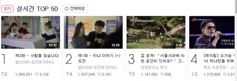 네이버 tv캐스트에 실시간 top50에서 1위 2위가 전부 시우민 나오는 도전에 반하다야ㅋㅋㅋㅋ