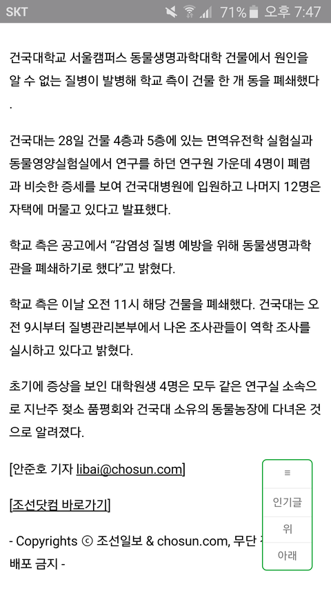 뜬금이라서 미안한데 건대 괴질병 발병했대