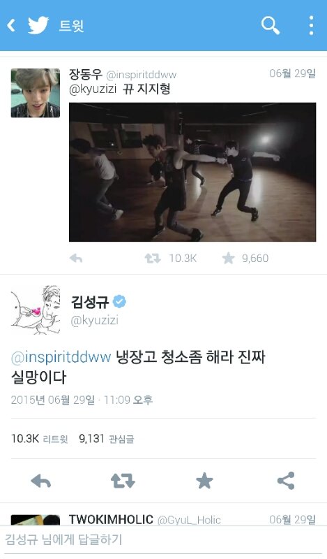 ㅋㅋㅋㅋ김성규 냉부끝나고 트윗으로 지네 멤버들 욕하면서 왜 아이스크림 먹고 안치우냐고 실망이라더니ㅋㅋㅋㅋㅋㅋ