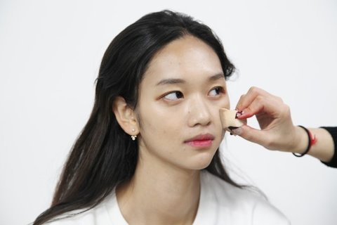 스펀지를 이용해 얼굴 전체에 베이스를 얇게 펴 발라줬습니다.