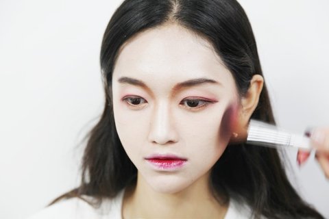핑크 계열의 컬러를 이용해 광대부터 얼굴 중앙 아랫부분까지 밑으로 내리듯 볼터치 해주세요!
