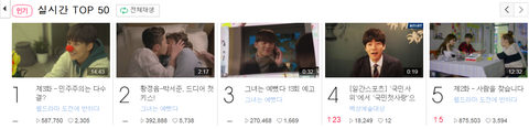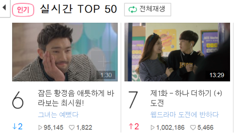 지금 현재 3화가 실시간 1위 2화가 5위야 1화는 비록7위지만 100만뷰 돌파!!