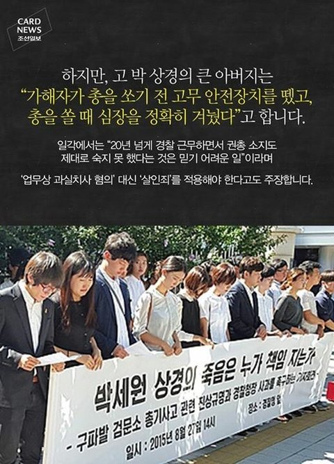 현재 검찰은 가해자인 박 경위가 총기를 다루면서 실탄 장전 여부를 확인하지 않았고, 안전장치까지 제거한 채 방아쇠를 당겼다는 점에서 살인의 미필적 고의가 있었다고 보고 살인 혐의를 적용하기로 했습니다.(원래는 업무상 과실치사 혐의만 적용)