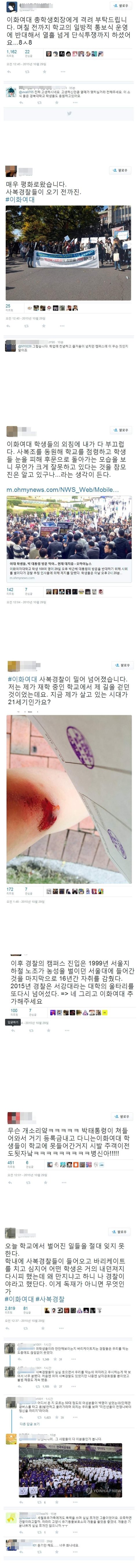 정말 민주주의가 바로서지 못했던 때에도 감히 경찰이 교문을 넘어서는 일은 없었건만.. 지금이 2015년지 독재정권 시대인지 모르겠습니다. 어디 감히 민중의 지팡이라는 경찰이 학생들의 배움의 장소에서 학생들을 막아서고 비웃고 조롱하고 그들에게 폭력을 행사합니까? 진정 이 나라가 민주주의가 제대로 실현되고 있는 나라입니까? 학생들이 정당하고 평화로운 방법으로 그들의 교정에서 그들의 목소리를 내려하는데 무슨 권리로 그들의 입을 틀어막는겝니까? 한 나라의 대통령이니 존중받아야한다, 우리나라를 대표하는 분이시니 함부로 욕해봤자 결국 우리 얼굴에 침뱉는 격이니 그러지말자, 그동안 수없이 자신에게 되뇌었습니다. 그러나 이번엔 그럴 수 없습니다. 내 친구들입니다. 그들에게 어떤 죄가 있기에 당신이 감히 그들을 탄압하려합니까? 내가 아는 내 친구들은 참 똑똑하고 성실하고 올바른 친구들입니다. 따뜻하고 친절하며 올곧은 친구들입니다. 그런 그들에게 감히 사복경찰이라뇨? 중범죄를 저지른사람 잠복수사합니까? 무엇이 부끄러워 경찰제복을 벗으라 하십니까? 경호원일 뿐이라고 둘러대시렵니까? 신성한 교정에서 무슨 짓을 하는겁니까! 내 친구들을 탄압하지 마세요. 당신에겐 그럴 자격이 없습니다.