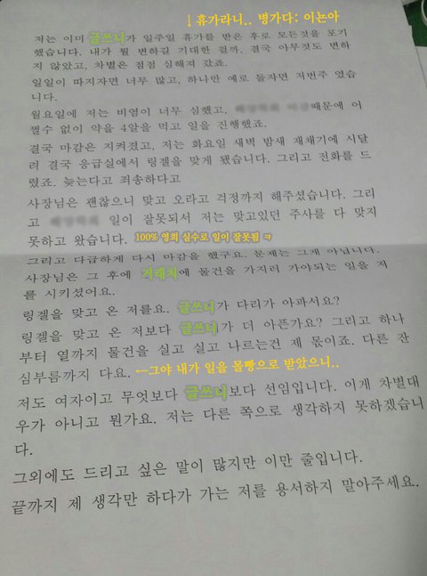 근데 틀린건... 맞았음 ㅠㅠ... 안틀리게하면되는데 ㅠㅠ...자기가 틀리게해놓고 지적한다고머라함;;ㅋㅋㅋ 무슨논린지모르겠지만 암튼 그렇게말함;;사장이 영희가우니까 맘이약해짐.. ㅋㅋ 결국내가 게 몫까지 2배로 그일을함..ㅠㅠ