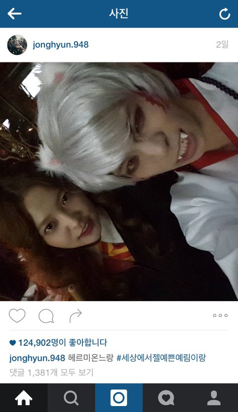 이번 sm할로윈파티때인데 역시 둘이 만나서 사진많이찍었나보다~~ㅋㅋ종현 태그 #세상에서 젤예쁜 예림이랑ㅋㅋㅋ예리맘인증ㅋㅋㅋㅋ