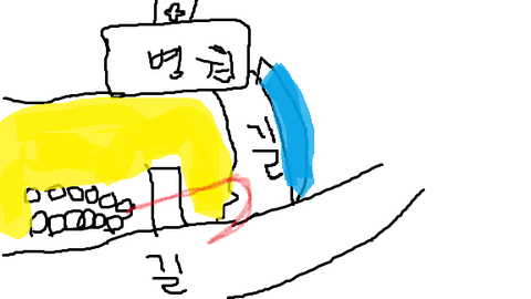 저 파란색 부분이 그림을 급하게 그리느라 그림에서는 그러지는 않은데, 꿈에서는 병원이랑 닿아있어서 못감.. 병원 뒷쪽은 잘 모르겠음)