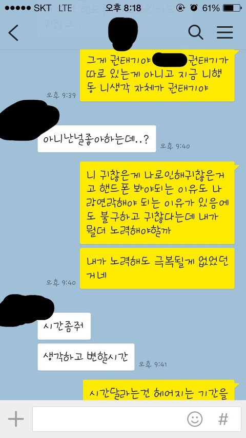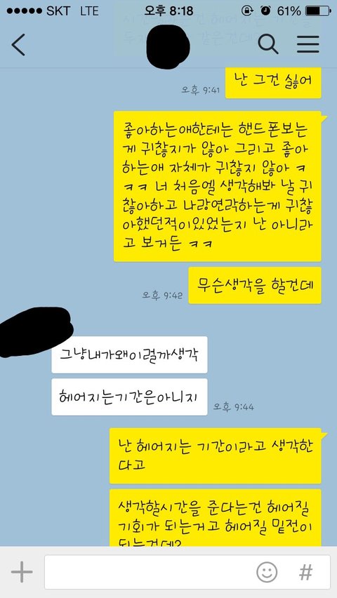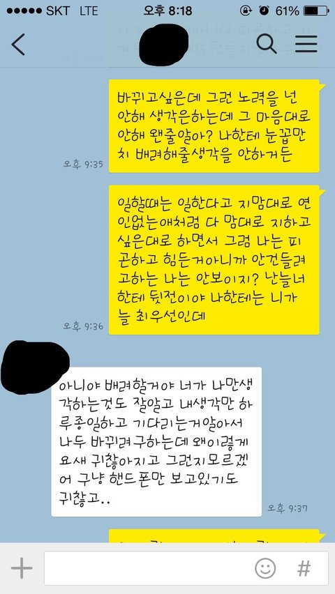 저는 3년째 연애중인 20대 중반이구요.애인도 동갑입니다. 지금 현재 애인이 이사를 가서 장거리 연애중인데.. 이미지 첨부하기전에 간단히 설명을드리자면 요새 자꾸 저를 귀찮아하는거같고 카톡도 제가 하는 질문에만 대답하는식에 전화통화를해도 피곤해하고 권태기느낌이 팍팍 들길래 참고 참다가 도저히 안되겠어서 다 터놓고 이야기를하게되었습니다. 카톡내용입니다~다들 그냥가지마시고 봐주세요 ! ㅠㅠ