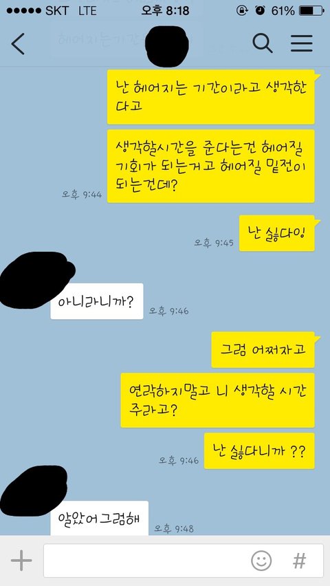 이렇게 카톡을 끝내고 난 뒤 ... 아무렇지 않게 연락은 하고있지만 제대로 푼 느낌과 해답이 들지않아서 찜찜해요.. 저도 제가 이러고 싶지않은데 피곤한 애인이 되기싫는데 나도 그러지말자 그러지말자해도 마음처럼 쉽게 끊어지지가 않아요.