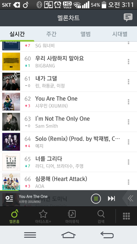 그리고 이건 3시 멜론 차트!  어제도 3시에 62위 였는데 오늘도 62위야 신기하다 민석이 첫 솔로곡이기도 하지만 노래도 좋아서 사람들이 많이 들어줬으면 좋겠어 ㅋㅋㅋㅋ